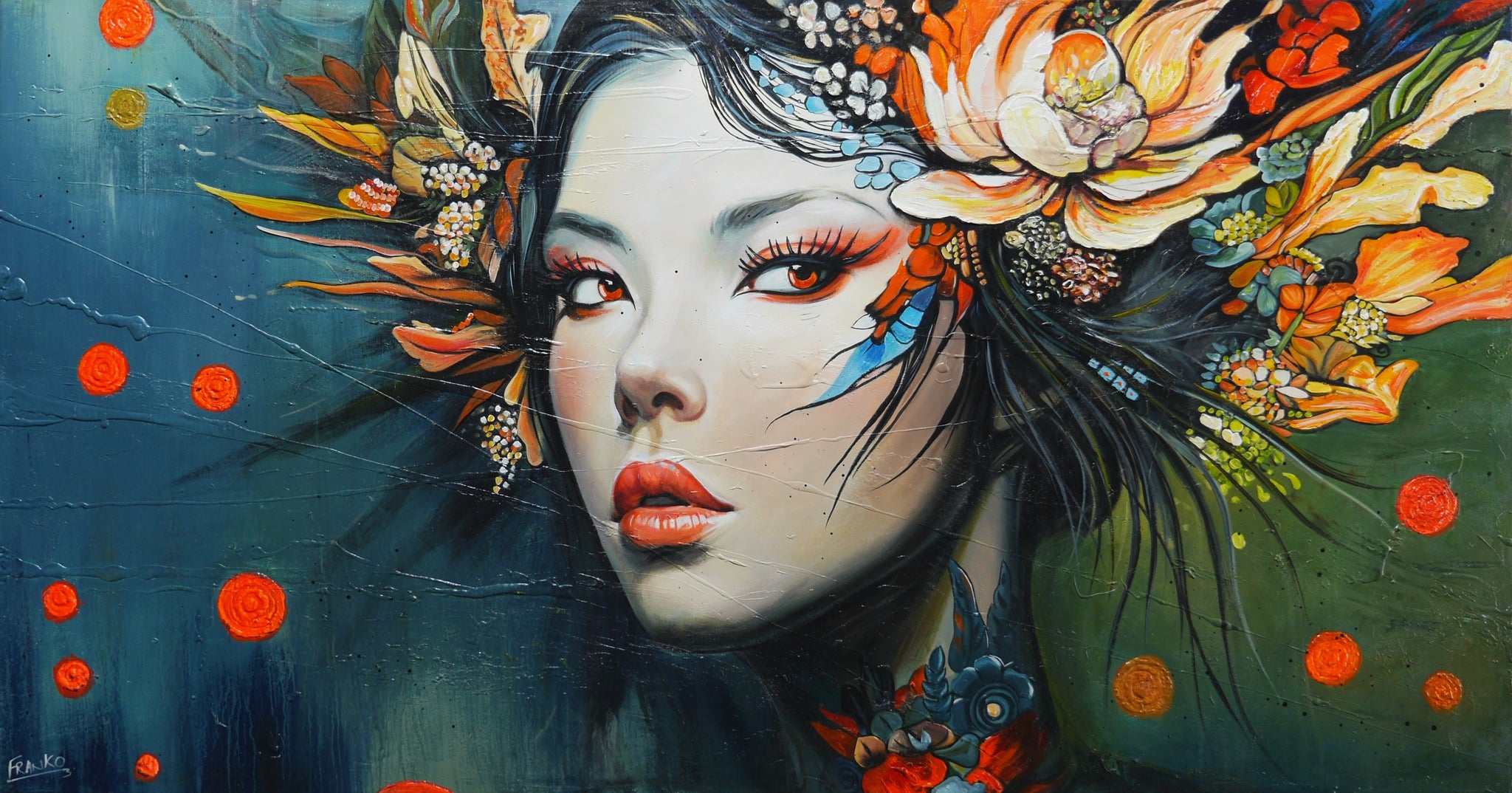 Hello spunky art lover! It's great to see you looking in on “Ayaka” meaning flower. This beauty is the latest addition to my "Heads" series and features jade, red, orange, yellow, olive green, blue, teal, jade, purple, turquoise, black and white acrylics, inks and oils on a textured and layered canvas base