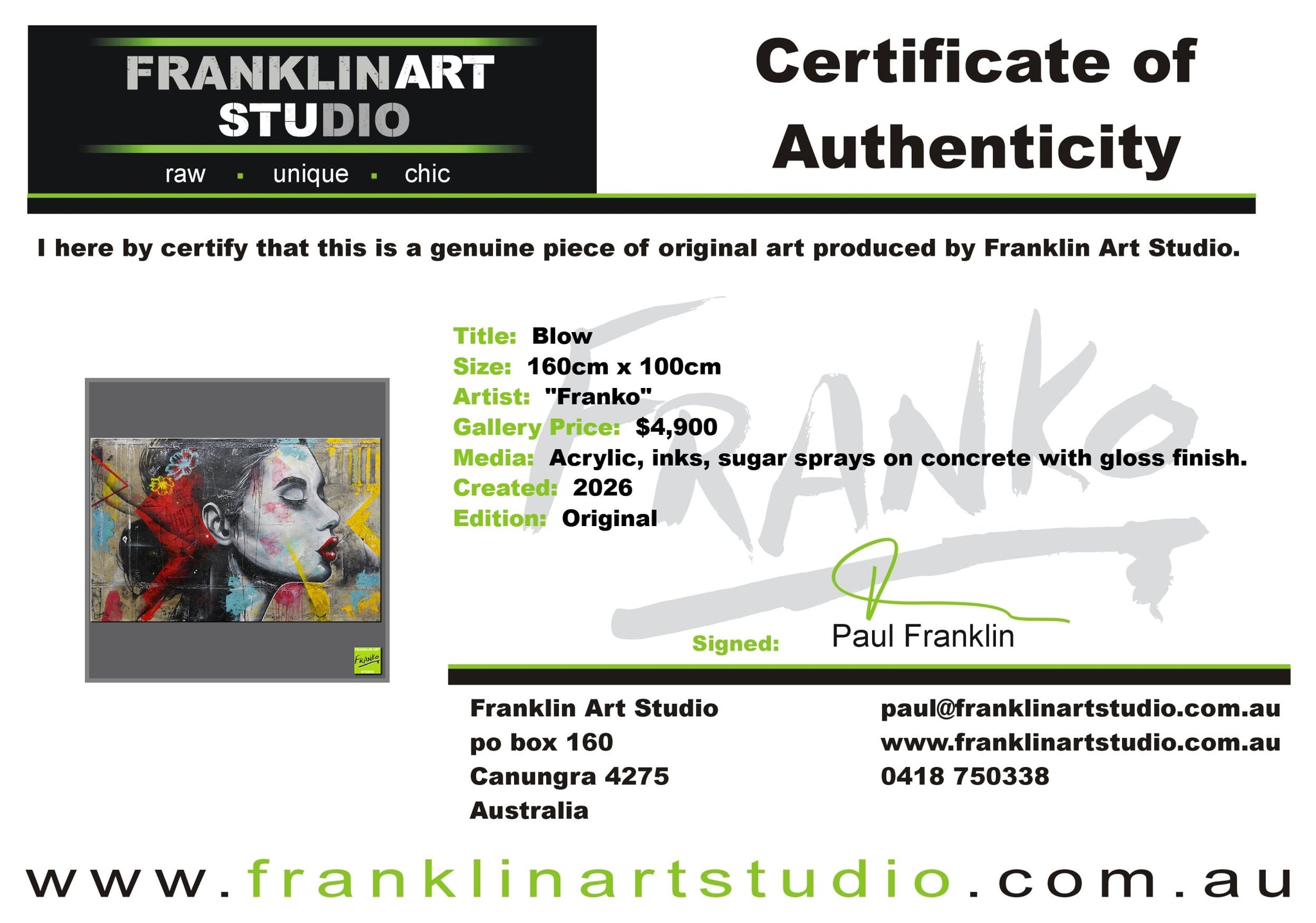 Global shipping is included in the listed prices however, if you happened to be in an extremely remote area or country, we may put our hand up and ask for a little bit of monetary assistance. We package the paintings securely in twin walled, reinforced, CUSTOM MADE “Franko” cartons, with additional protective inserts & of course the painting is wrapped in bubble wrap and often felt, for rub protection. We are the consummate professionals in all that we do. Our trusted freight partners are TNT, TOLL and DHL. Often with larger pieces and local deliveries, we arrange direct delivery with our own driver.