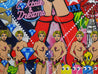 Hey spunky art lover, thank you for looking in on this funky piece... “Cabaret Astro” which features red, orange, yellow, green, blue, purple, pink, white, skin tone, metallic gold, chrome, black and grey acrylics, sugar sprays and inks. This is Iconic pop art designed to lace with your childhood mems and features references to classic gaming and pop icons.