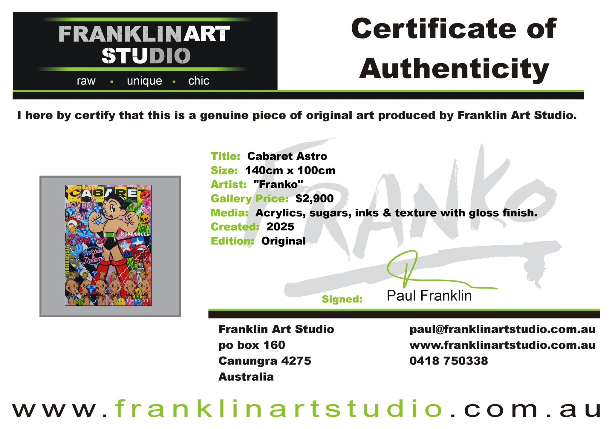 Global shipping is included in the listed prices however, if you happened to be in an extremely remote area or country, we may put our hand up and ask for a little bit of monetary assistance. We package the paintings securely in twin walled, reinforced, CUSTOM MADE “Franko” cartons, with additional protective inserts & of course the painting is wrapped in bubble wrap and often felt, for rub protection. We are the consummate professionals in all that we do. Our trusted freight partners are TNT, TOLL and DHL. Often with larger pieces and local deliveries, we arrange direct delivery with our own driver.