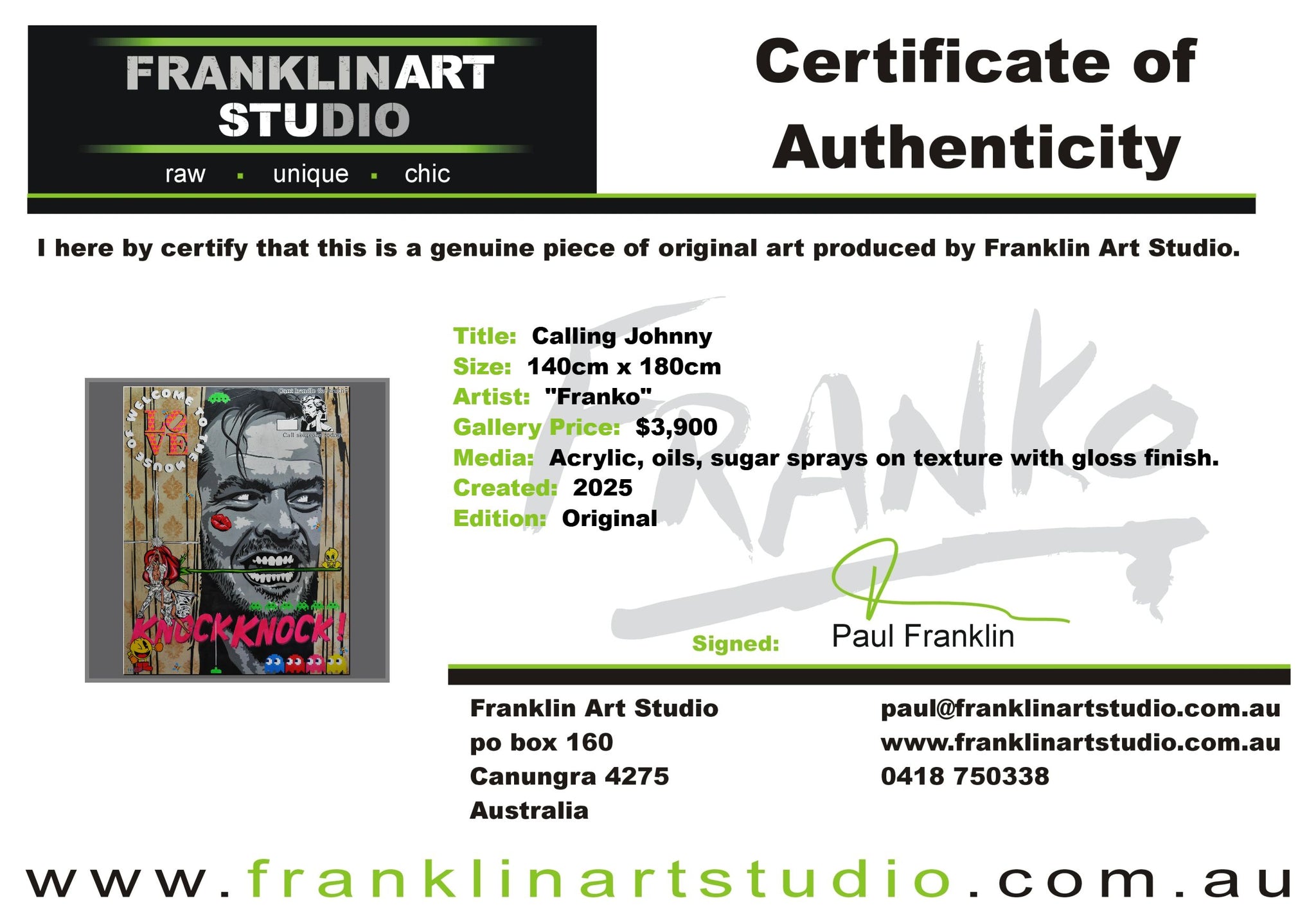 Global shipping is included in the listed prices however, if you happened to be in an extremely remote area or country, we may put our hand up and ask for a little bit of monetary assistance. We package the paintings securely in twin walled, reinforced, CUSTOM MADE “Franko” cartons, with additional protective inserts & of course the painting is wrapped in bubble wrap and often felt, for rub protection. We are the consummate professionals in all that we do. Our trusted freight partners are TNT, TOLL and DHL. Often with larger pieces and local deliveries, we arrange direct delivery with our own driver.