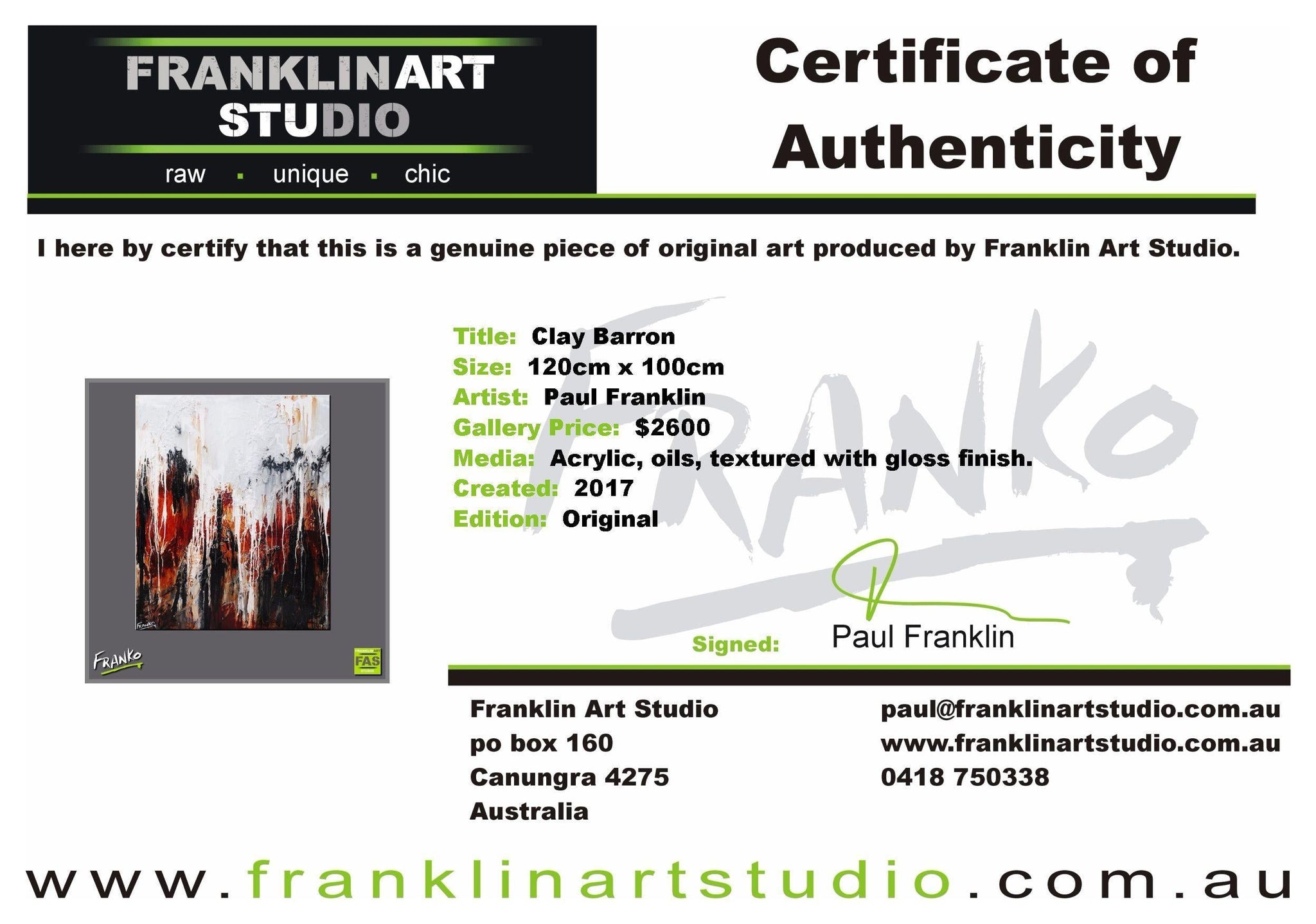 Global shipping is included in the listed prices however, if you happened to be in an extremely remote area, we may put our hand up and ask for a little bit of monetary assistance. We package the paintings securely in twin walled, reinforced, CUSTOM MADE “Franko” cartons, with additional protective inserts & of course the painting is wrapped in bubble wrap for rub protection. Wendy & I are the consummate professionals in all that we do. Our trusted freight partners are TNT, Fastway and DHL. Often with larger pieces and local deliveries, we arrange direct delivery with our own driver.