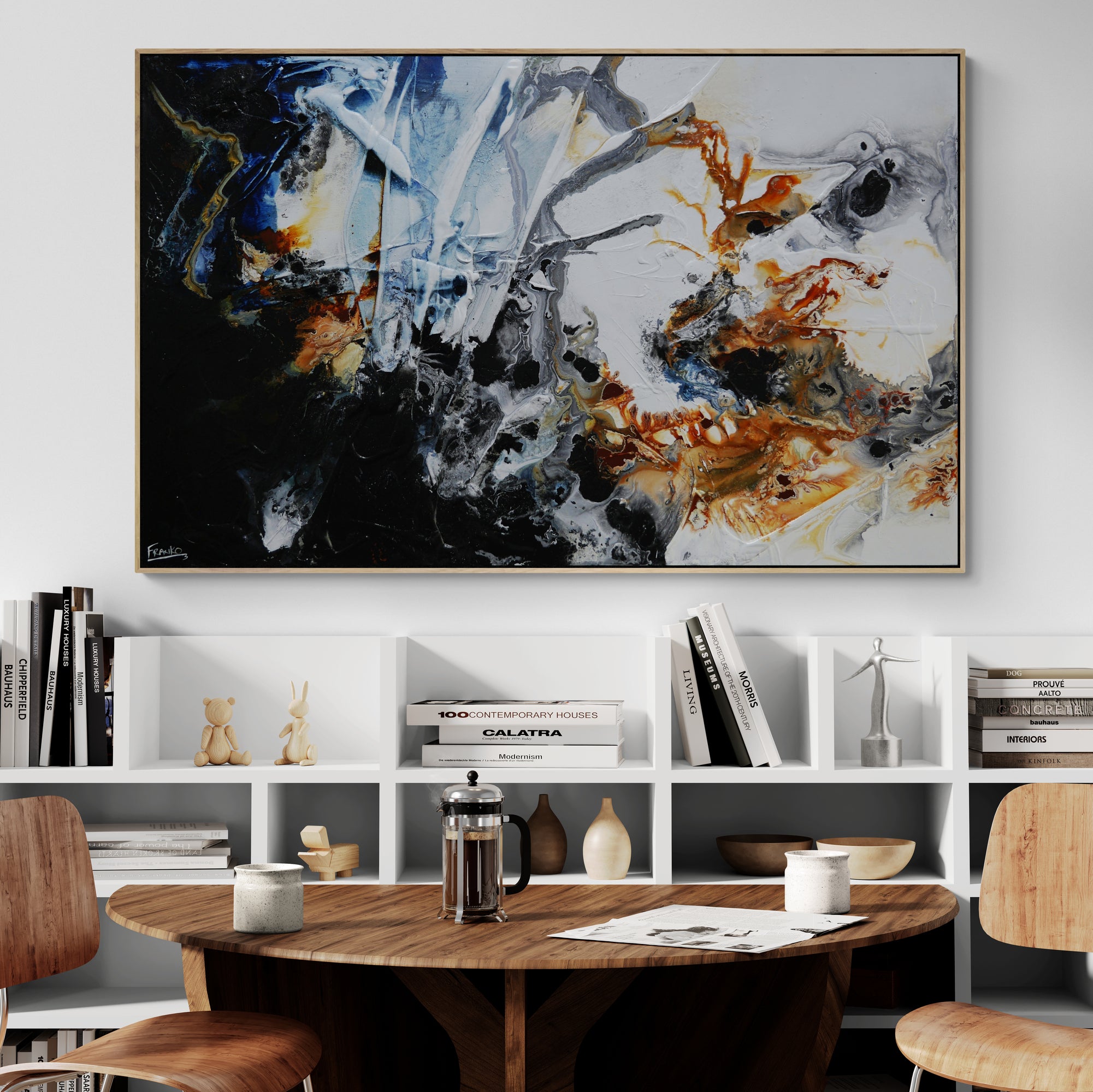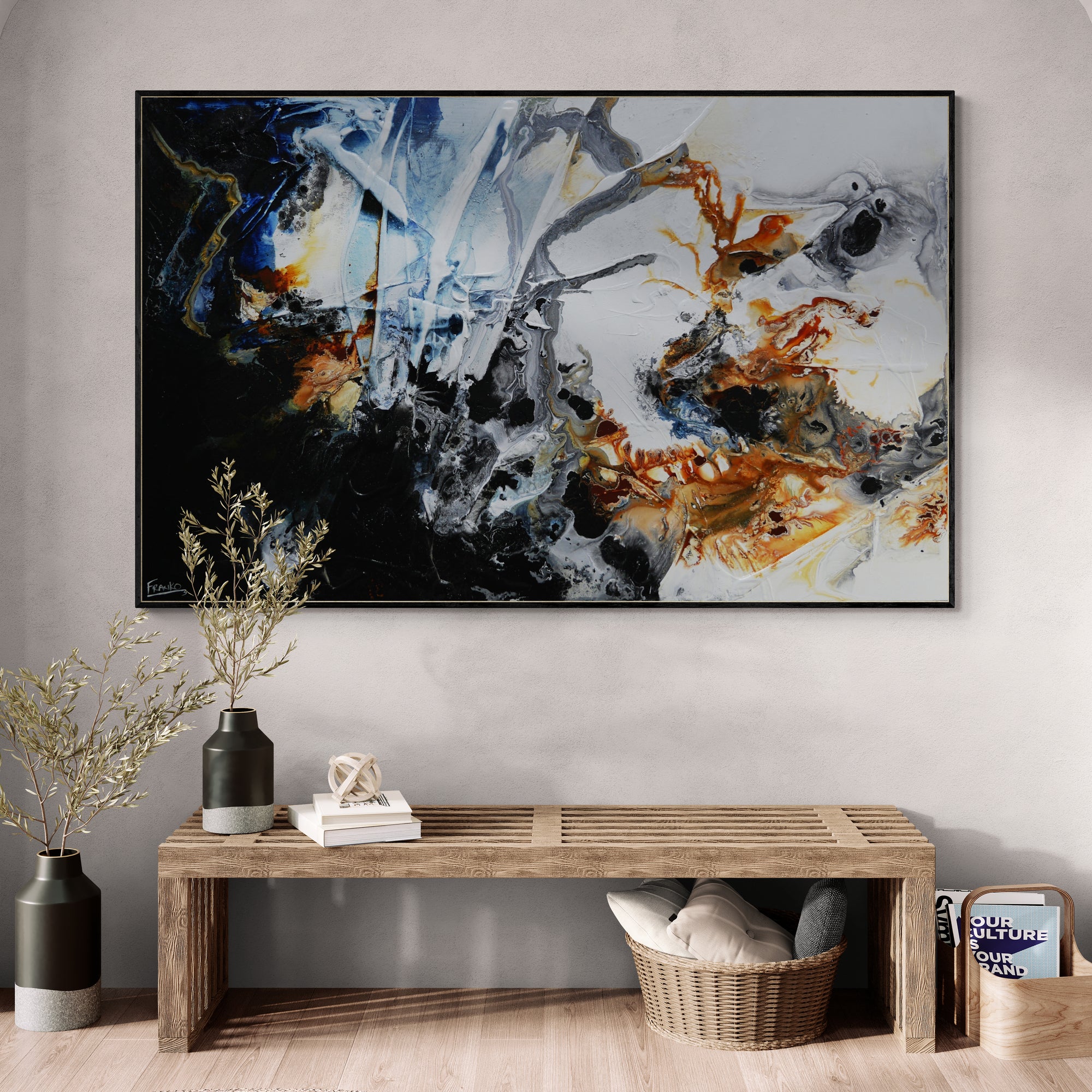 Provided with listings are some insitu images. We strive to ensure they are accurate in scale. Sometimes we will add an external frame to the painting insitu, to provide a vibe for how that would look also. As mentioned above, my pieces arrive ready to install with gallery finished edges and honestly, most people don’t add external framing. However, it is of course an option. If you have any questions, please let me know. We are here to help and want to make it as easy as possible for you if your décor aspirations require it.