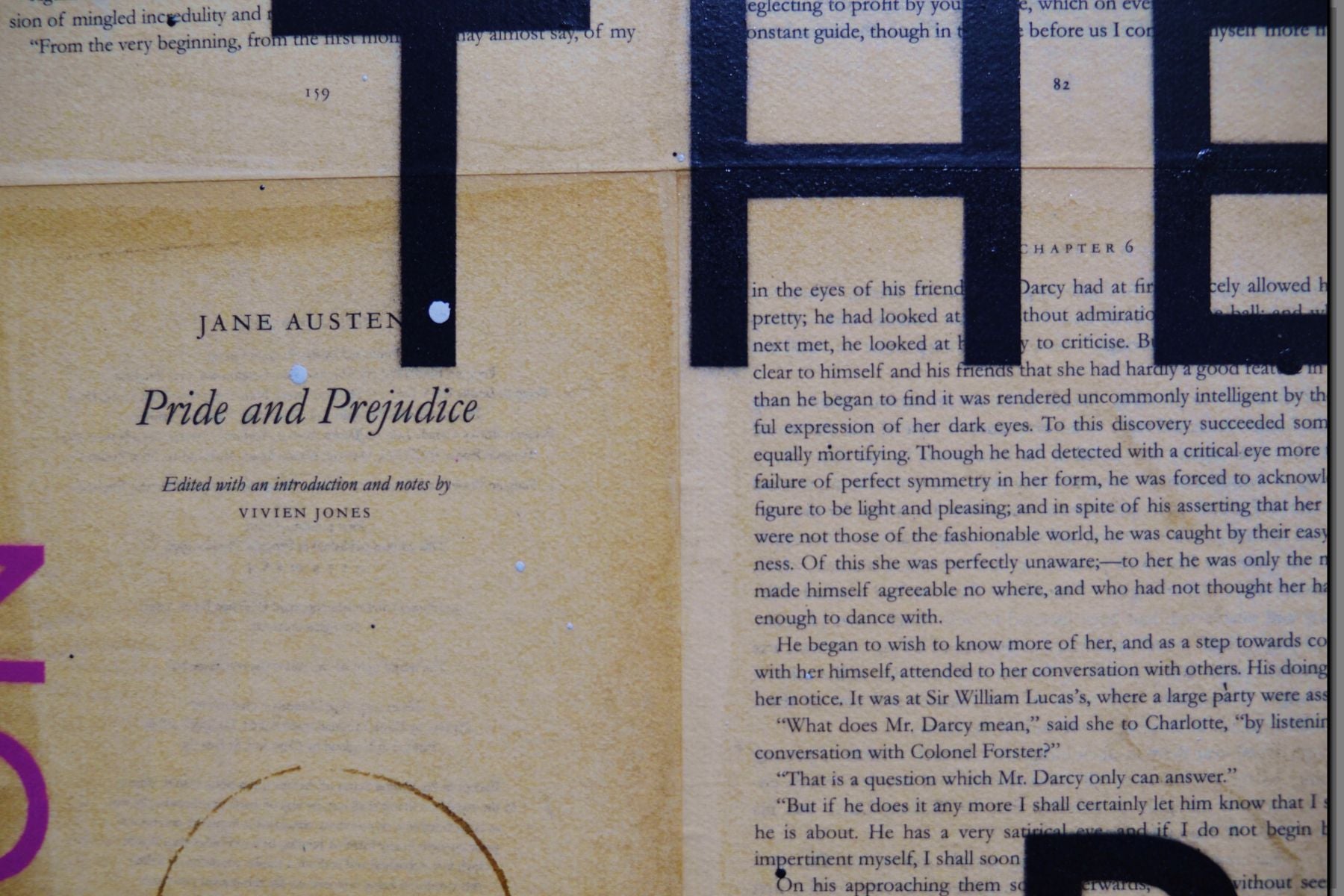 Painted on pages from the book "Pride and Prejudice" by Jane Austen which are stuck to the canvas and sealed with a binding varnish to ensure they will stay where they are meant to... On the canvas.