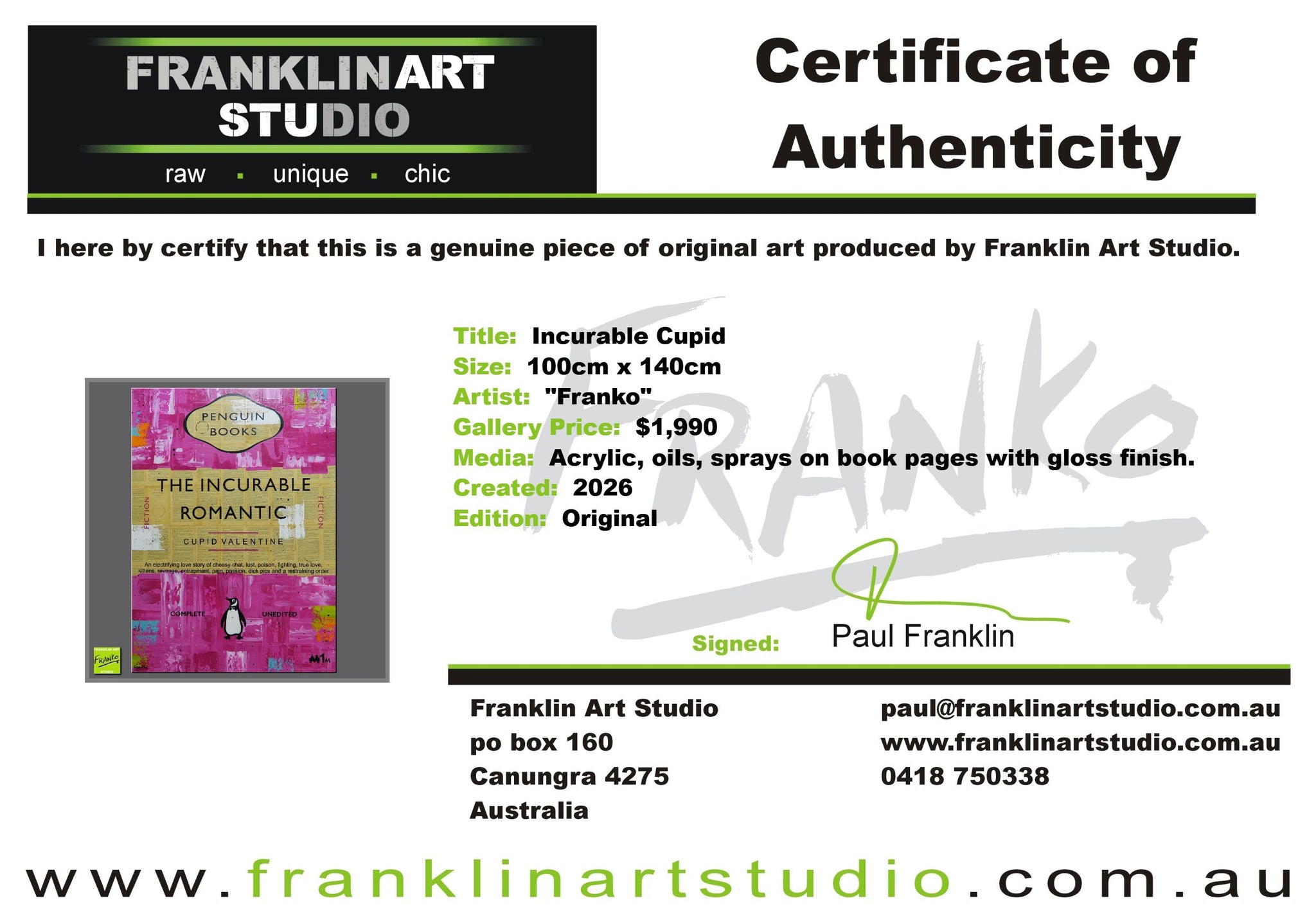Global shipping is included in the listed prices however, if you happened to be in an extremely remote area or country, we may put our hand up and ask for a little bit of monetary assistance. We package the paintings securely in twin walled, reinforced, CUSTOM MADE “Franko” cartons, with additional protective inserts & of course the painting is wrapped in bubble wrap and often felt, for rub protection. We are the consummate professionals in all that we do. Our trusted freight partners are TNT, TOLL and DHL. Often with larger pieces and local deliveries, we arrange direct delivery with our own driver.