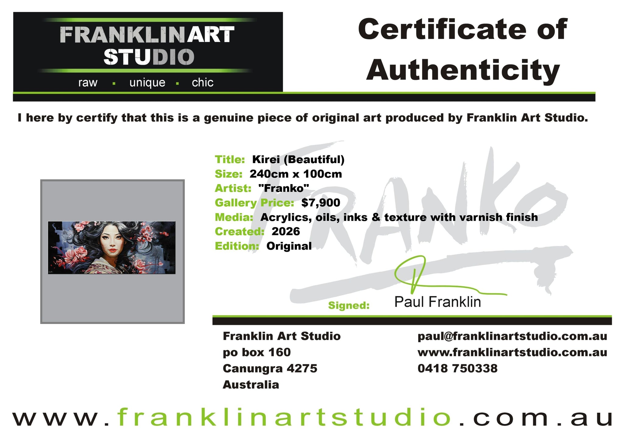 Global shipping is included in the listed prices however, if you happened to be in an extremely remote area or country, we may put our hand up and ask for a little bit of monetary assistance. We package the paintings securely in twin walled, reinforced, CUSTOM MADE “Franko” cartons, with additional protective inserts & of course the painting is wrapped in bubble wrap and often felt, for rub protection. We are the consummate professionals in all that we do. Our trusted freight partners are TNT, TOLL and DHL. Often with larger pieces and local deliveries, we arrange direct delivery with our own driver.