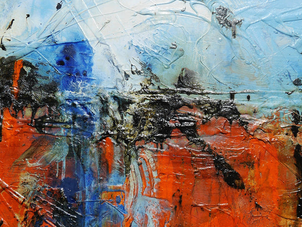 G'day spunky art lover! Great to see you here looking in on this painting! “Orange Regatta” features stunning oranges, blues, black, rusts, oxide and white acrylics, oils and inks on a heavily textured and layered canvas base.