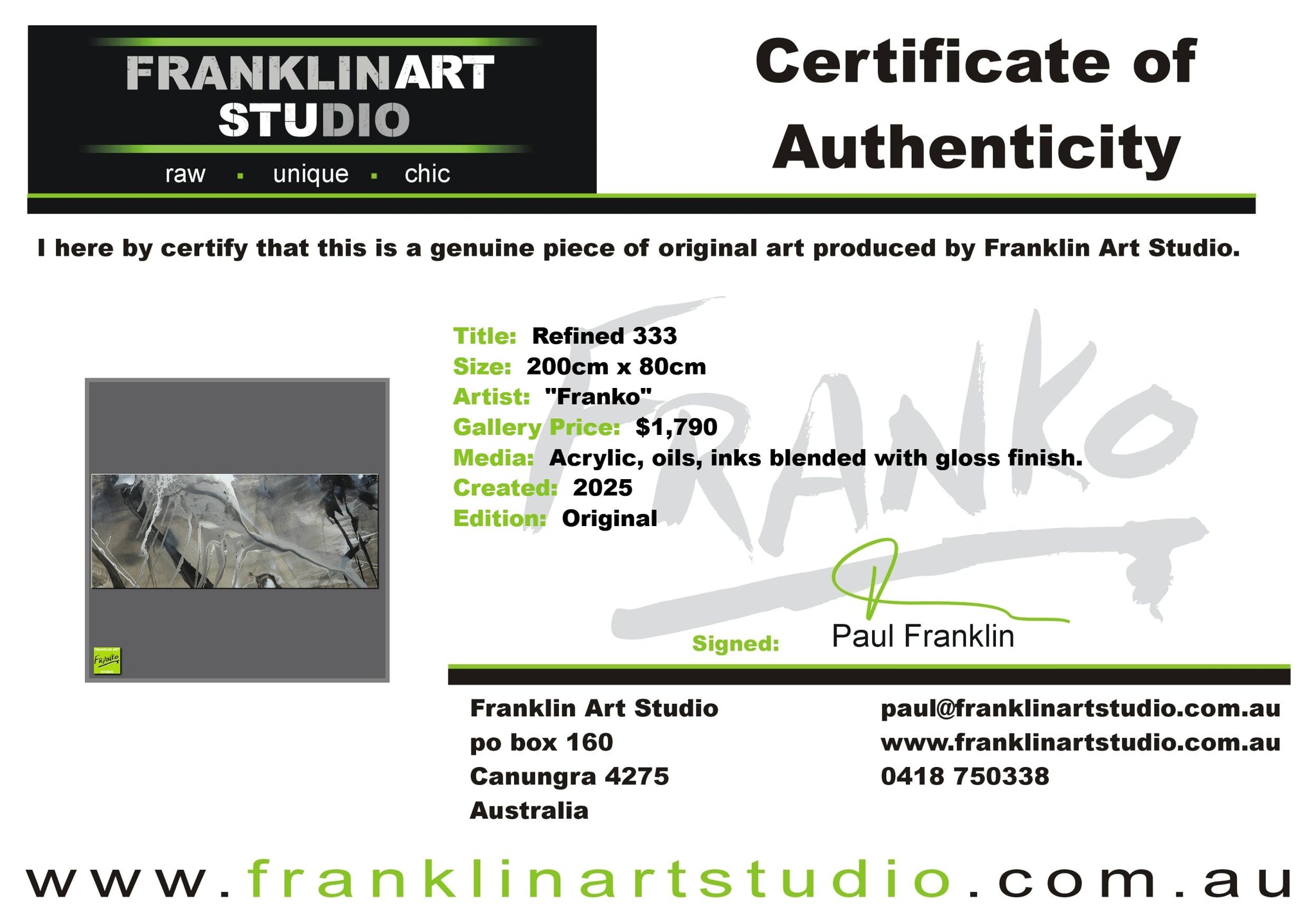 Global shipping is included in the listed prices however, if you happened to be in an extremely remote area or country, we may put our hand up and ask for a little bit of monetary assistance. We package the paintings securely in twin walled, reinforced, CUSTOM MADE “Franko” cartons, with additional protective inserts & of course the painting is wrapped in bubble wrap and often felt, for rub protection. We are the consummate professionals in all that we do. Our trusted freight partners are TNT, TOLL and DHL. Often with larger pieces and local deliveries, we arrange direct delivery with our own driver.