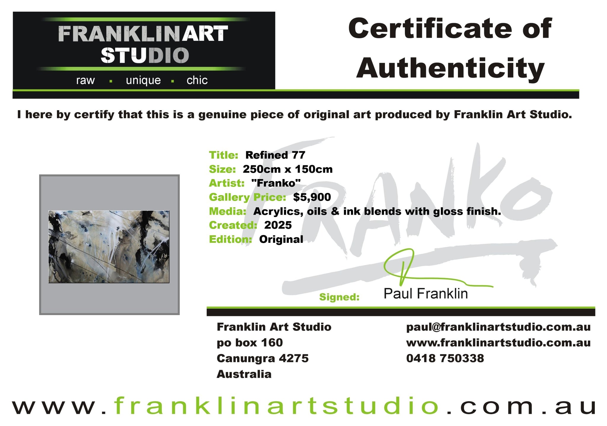 Global shipping is included in the listed prices however, if you happened to be in an extremely remote area or country, we may put our hand up and ask for a little bit of monetary assistance. We package the paintings securely in twin walled, reinforced, CUSTOM MADE “Franko” cartons, with additional protective inserts & of course the painting is wrapped in bubble wrap and often felt, for rub protection. We are the consummate professionals in all that we do. Our trusted freight partners are TNT, TOLL and DHL. Often with larger pieces and local deliveries, we arrange direct delivery with our own driver.