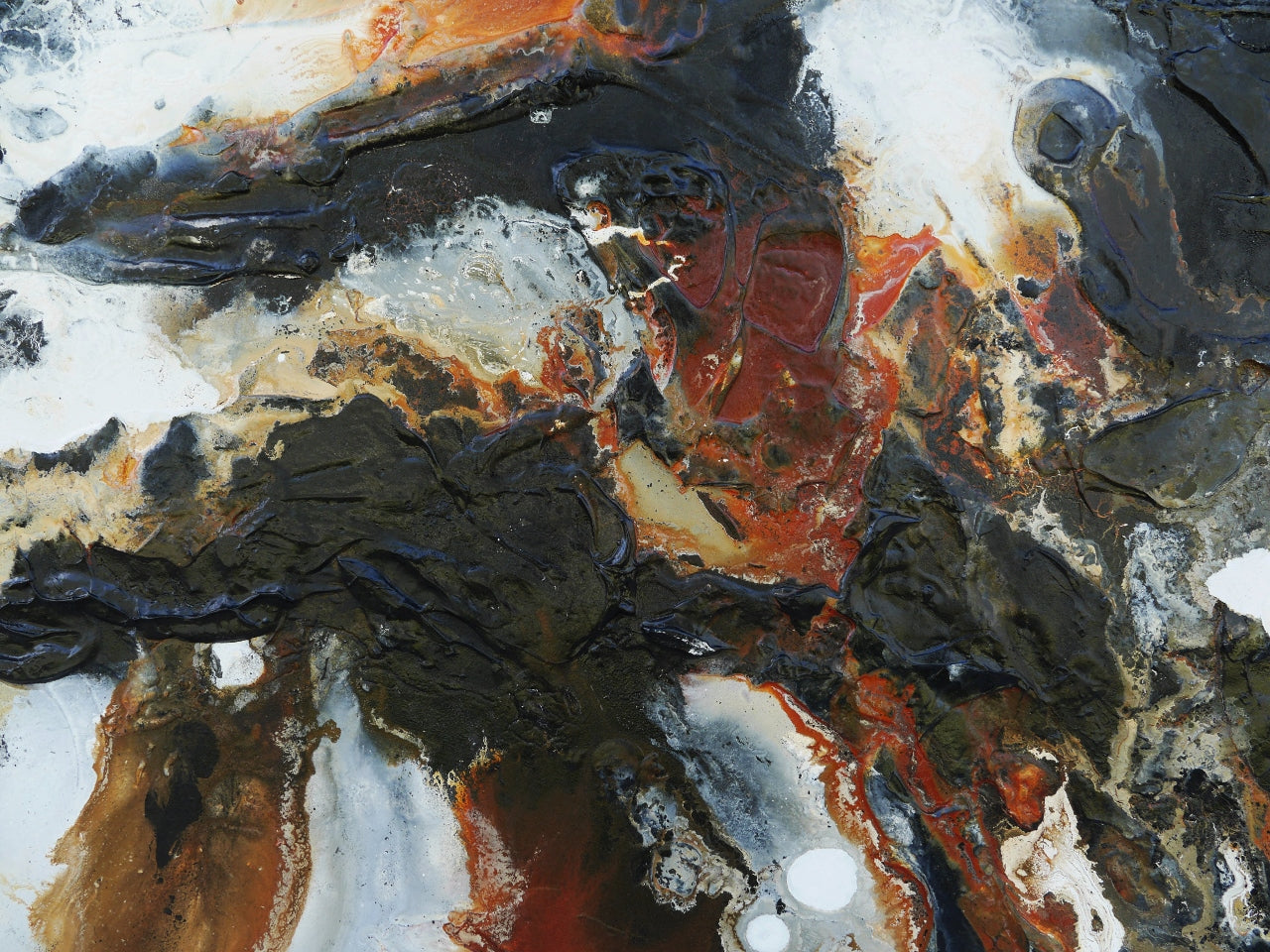All abstracts come off a deep base and always include textured layers from the base to the top. This painting is a mixture of acrylics, inks and milked sugars with intermittent use of oil based layers. I tend to use my hands a lot in these pieces and normally end up covered from head to toe in paint. I’ll also enlist the use of brushes and spatulas as the layers move to the top finishes.