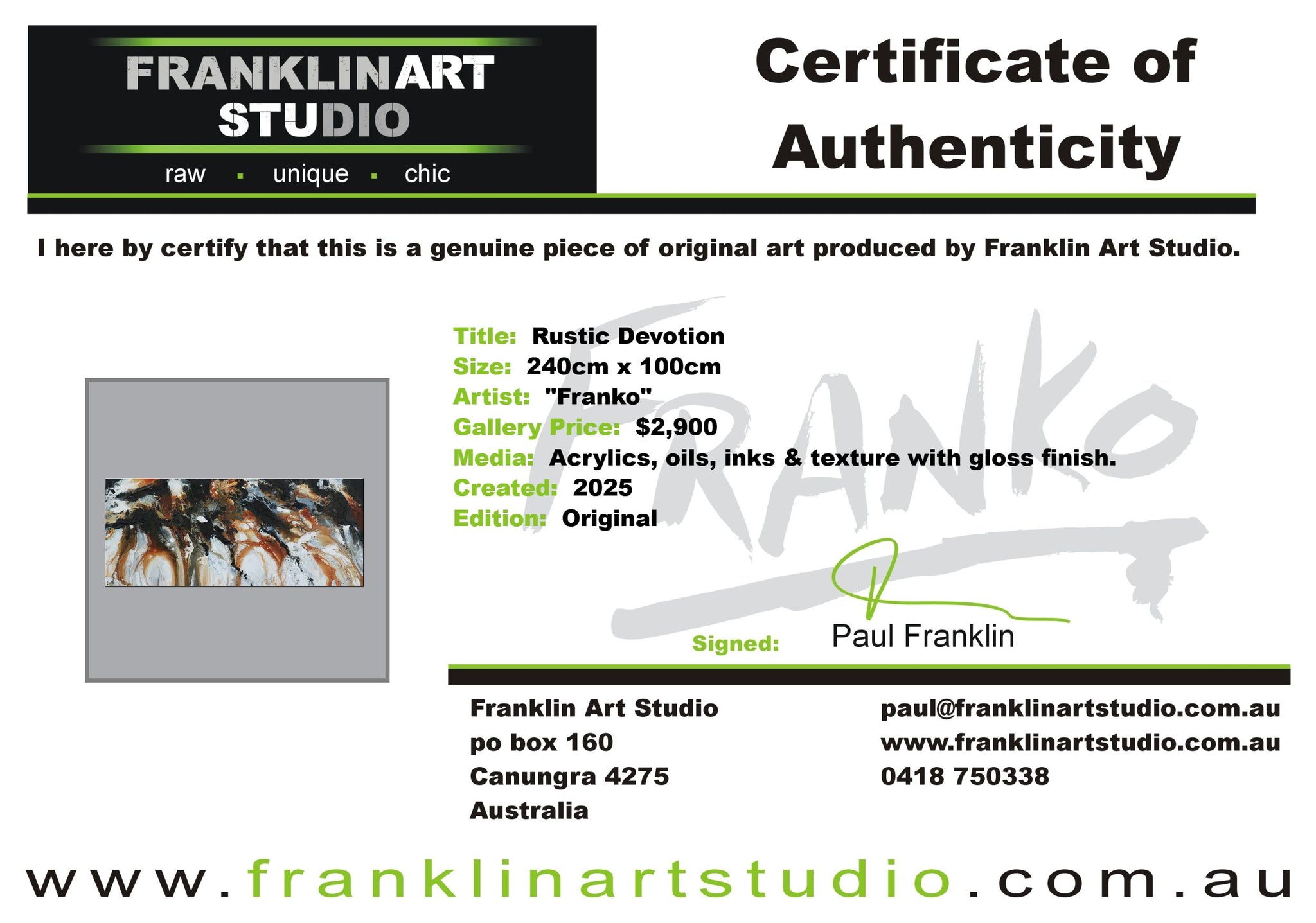 Global shipping is included in the listed prices however, if you happened to be in an extremely remote area or country, we may put our hand up and ask for a little bit of monetary assistance. We package the paintings securely in twin walled, reinforced, CUSTOM MADE “Franko” cartons, with additional protective inserts & of course the painting is wrapped in bubble wrap and often felt, for rub protection. We are the consummate professionals in all that we do. Our trusted freight partners are TNT, TOLL and DHL. Often with larger pieces and local deliveries, we arrange direct delivery with our own driver.