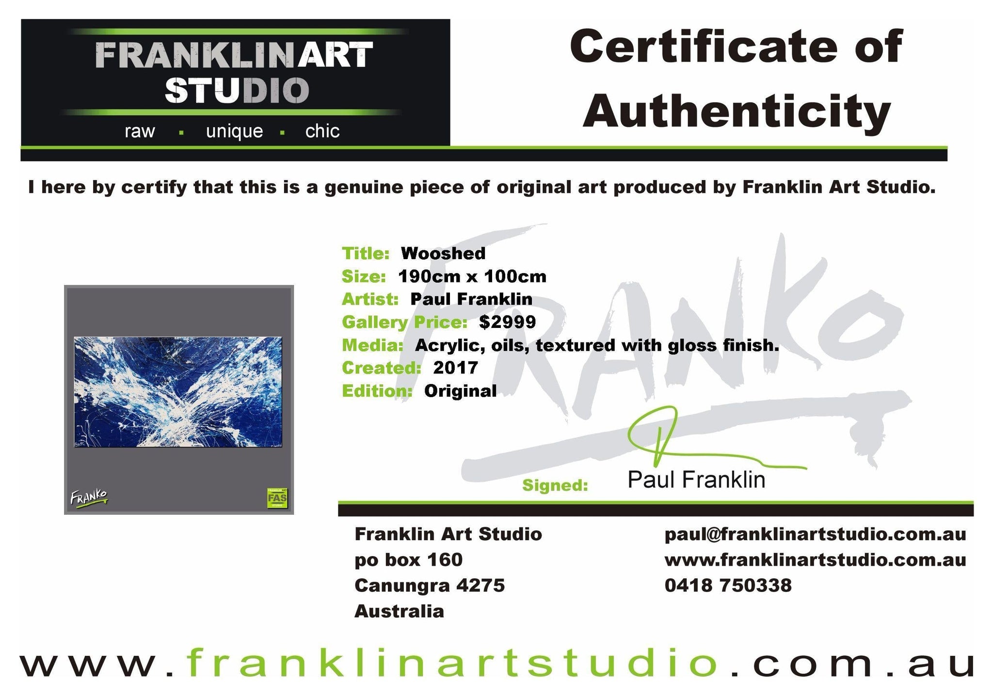 Global shipping is included in the listed prices however, if you happened to be in an extremely remote area, we may put our hand up and ask for a little bit of monetary assistance. We package the paintings securely in twin walled, reinforced, CUSTOM MADE “Franko” cartons, with additional protective inserts & of course the painting is wrapped in bubble wrap for rub protection. Wendy & I are the consummate professionals in all that we do. Our trusted freight partners are TNT, Fastway and DHL. Often with larger pieces and local deliveries, we arrange direct delivery with our own driver.